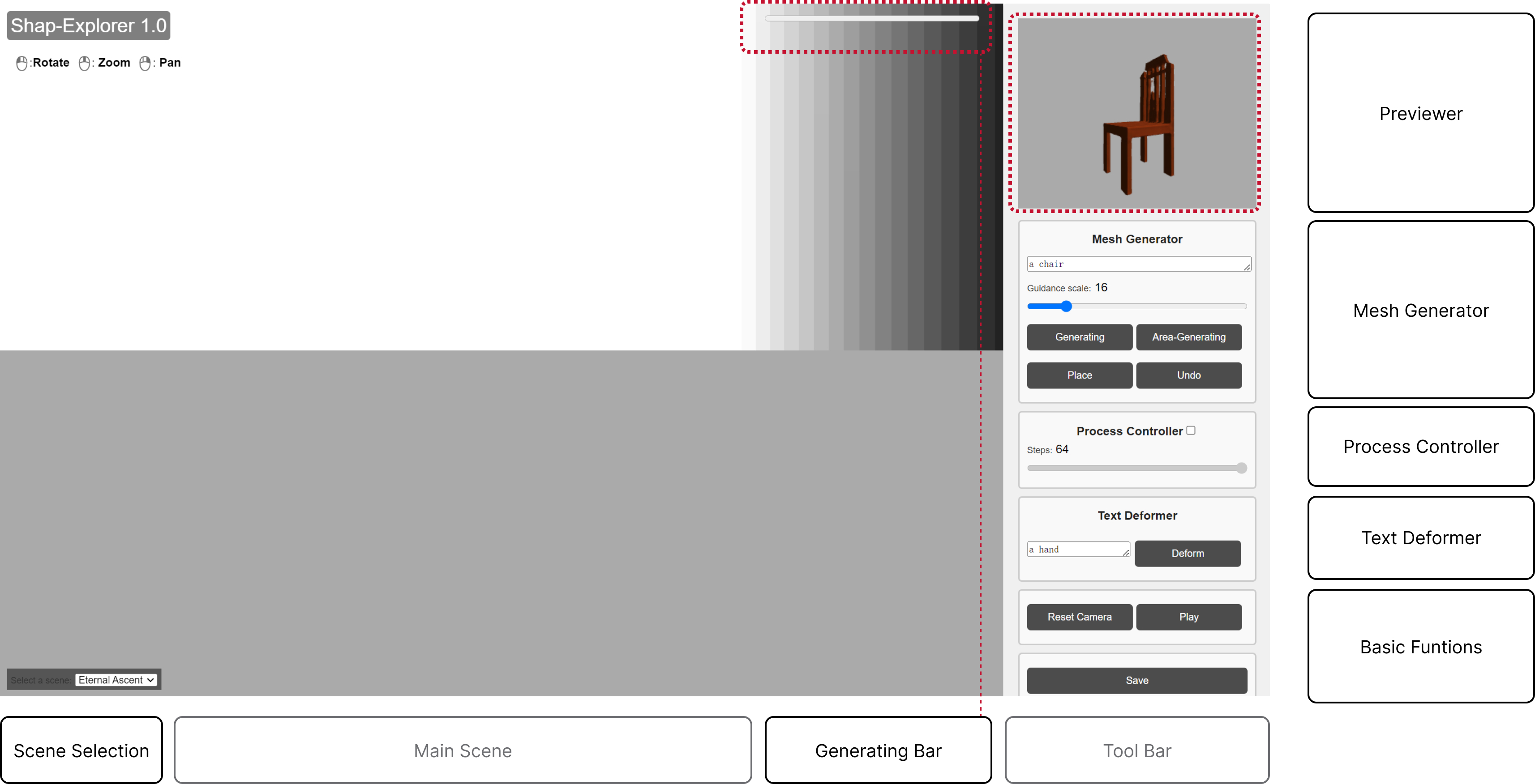 To bridge this gap, this research introduces Shap-Explorer, a tool that streamlines the use of T23D, enabling users to iteratively modify the output models through mesh generator and control the generation through process controller and text deformer. Through a preliminary user study, this research examines the affordance of T23D and the impact of enhanced interactions on the generative system, such as providing design alternatives.